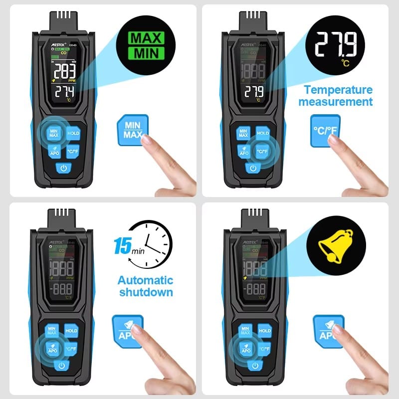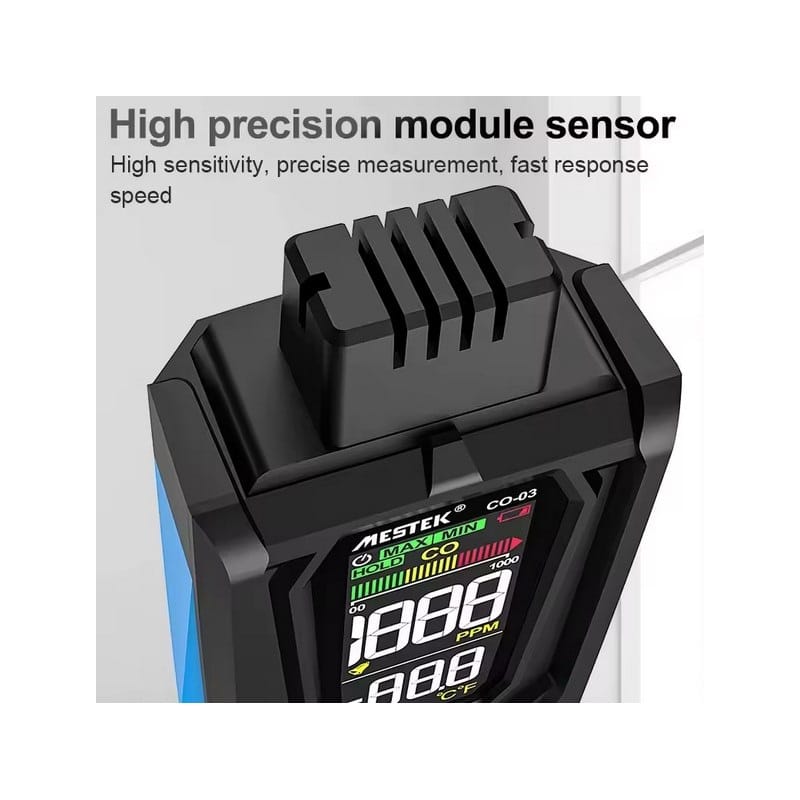 مونوکسید کربن سنج مستک مدل CO-03 مونوکسید را در محیط تشخیص میدهد و غلظت بین یک تا 1000 PPM را اندازه گیری میکند . به محض کشف CO زنگ دستگاه روشن و روی صفحه نمایش LCD مقادیر نمایش داده میشوند. برای مقادیر CO بالاتر از 200PPM صدای زنگ دستگاه ممتد میشود.توانایی تشخیص میزان گاز CO در زمان بسیار کوتاه با دقت اندازه گیری بالا از ویژگی این CO متر می باشد. از دیگر ویژگی های این CO متر می توان به قابلیت صفر دستگاه به صورت خودکار یا دستی، امکان ثبت مقادیر تا ۱۰ گروه از داده ها بر روی حافظه دستگاه و امکان خاموشی دستگاه به صورت خودکار اشاره کرد.